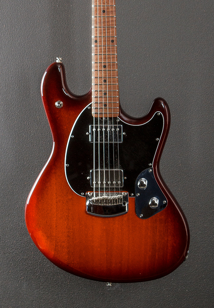 Burnt Amber, High gloss polyester body finish, Okoume body, Small C shaped roasted Maple neck with a 10" radius roasted Maple fingerboard and high profile/medium stainless steel frets, 25.5" scale length, 1 5/8th" nut width, Music Man custom wound humbucking bridge and neck pickups, 3-way toggle switching with the master volume and tone controls, Ernie Ball Musicman tremolo with the bent steel saddles, Schaller M6-IND locking tuners, The neck thickness is .87″ at the first and .96″ at the 12th frets, 7.6 pounds, With Ernie Ball Music Man hardshell case, Excellent