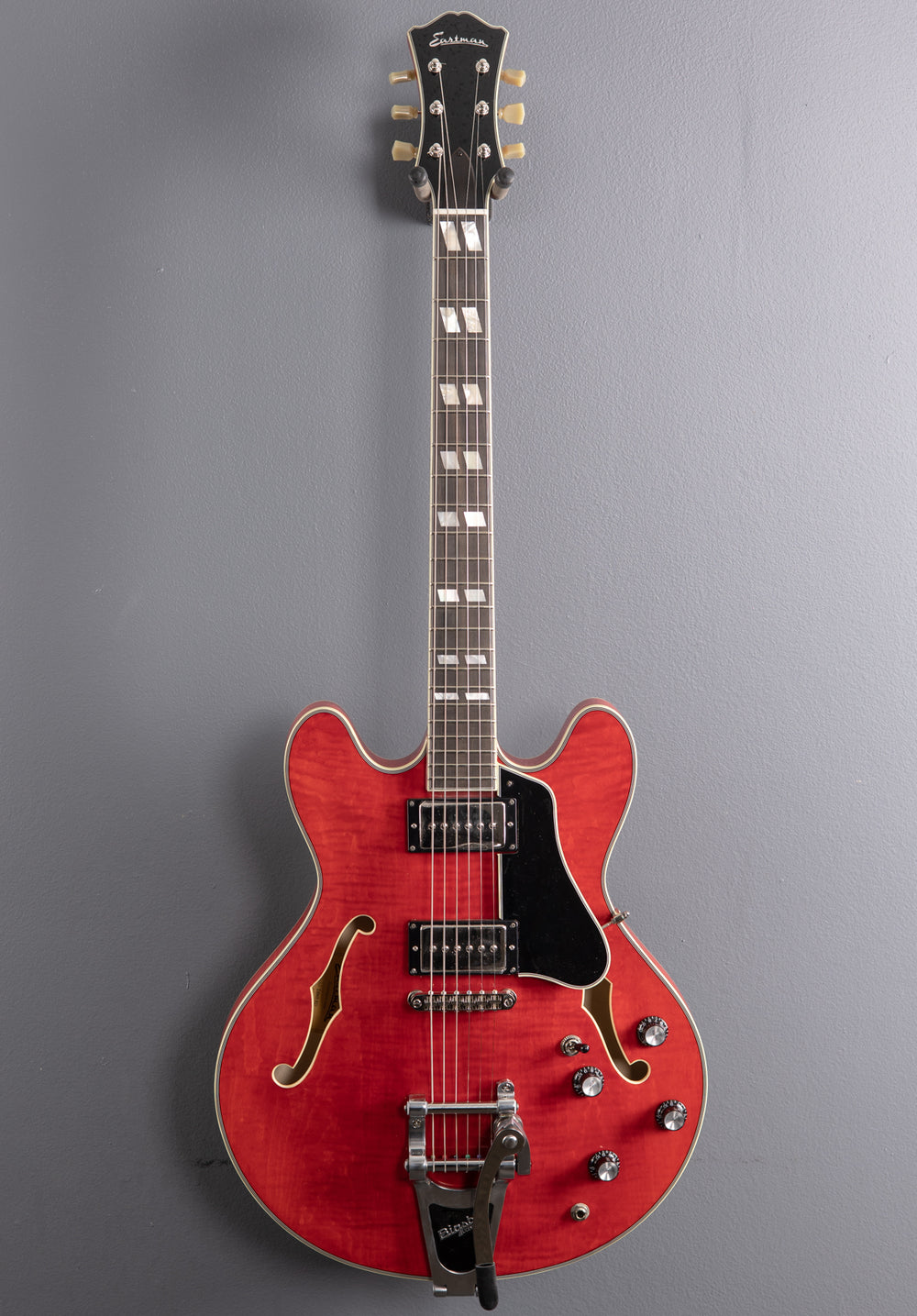 Excellent Condition, Transparent Red, Gloss finish, Semi-hollow laminated Flame Maple body with the center block, Multi-ply Ivoroid/Black binding, Bound 12” radius Ebony fingerboard with the Pearl split block Parallelogram inlays on a traditional even C shaped Maple neck, 24.75” scale length, 1 3/4” nut width, Seymour Duncan Phat Cat bridge and neck pickups, 3-way toggle switching with the volume and tone controls for each pickup, Gotoh tune-o-matic bridge and a Bigsby B70 vibrato, Vintage style tuners, 8.8 pounds, With hardshell case.