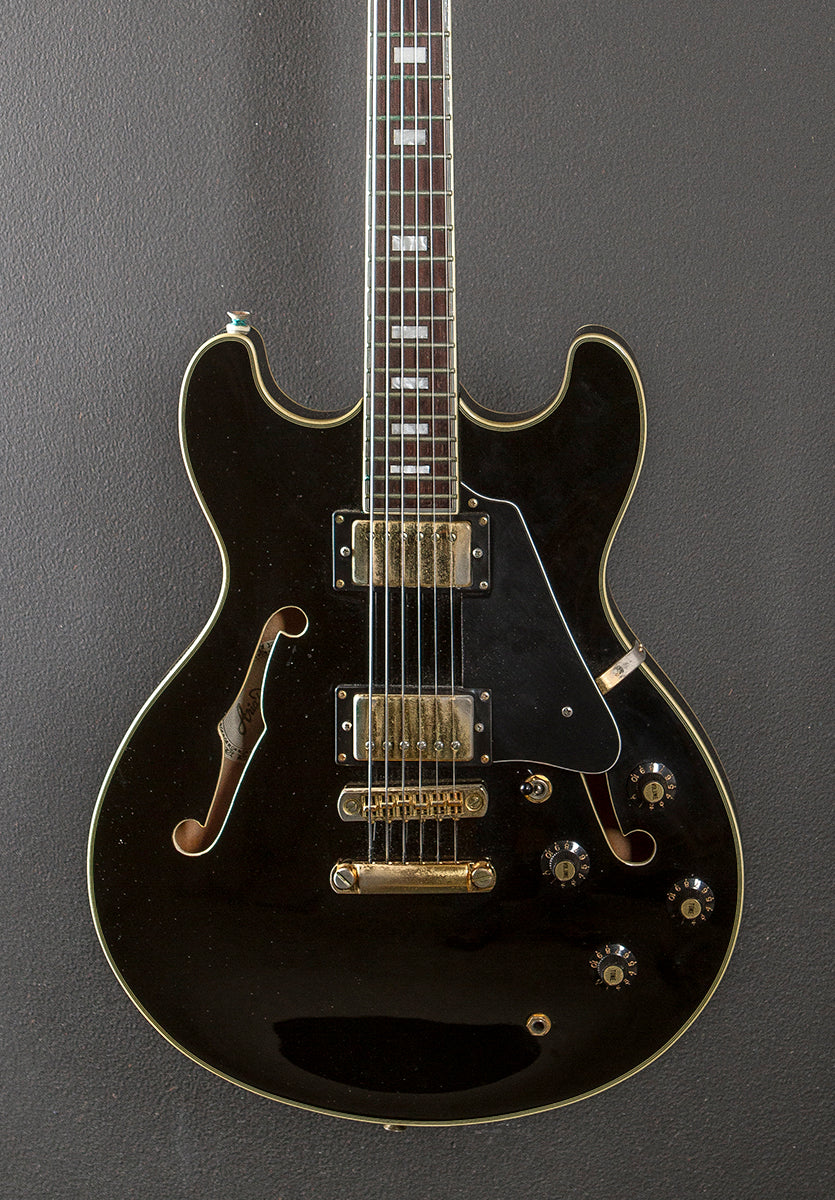 Black, Made in Korea, Gloss finish, Hollow laminated Maple body with the sound block under the bridge, Slim C shaped Mahogany neck with a bound 12" radius Rosewood fingerboard and medium frets, 24.75" scale length, 1 11/16th" nut width, Stock humbucking bridge and neck pickups, 3-way toggle switching with the volume and tone controls for each pickup, Tune-o-matic bridge and stop tailpiece, Cast/sealed tuners, The neck thickness is .79″ at the first and .91″ at the 12th frets, 7.0 pounds, With hardshell case, Very good