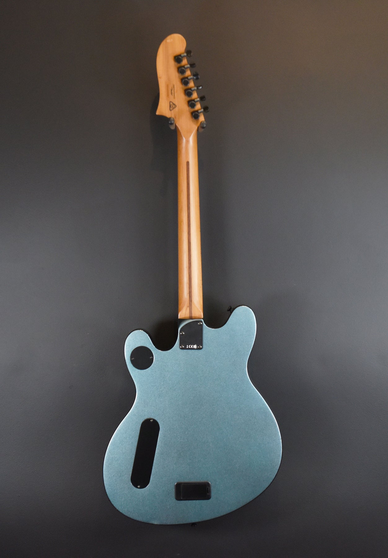 Gunmetal Metallic, Crafted in Indonesia, Gloss polyurethane body finish, Semi-hollow laminated Maple body, Thin C shaped roasted Maple neck with a 12” radius roasted Maple fingerboard and jumbo frets, 25.5″ scale length, 1 5/8th″ nut width, Newer passive VH59A humbucking bridge and neck pickups were installed, 3-way toggle switching with the master volume and tone controls, Tune-o-matic style bridge and stop tailpiece, Cast/sealed tuners, 7.1 pounds, Very Good, with gig bag. Neck depth - 1st fret: .85" 12th fret: .90"