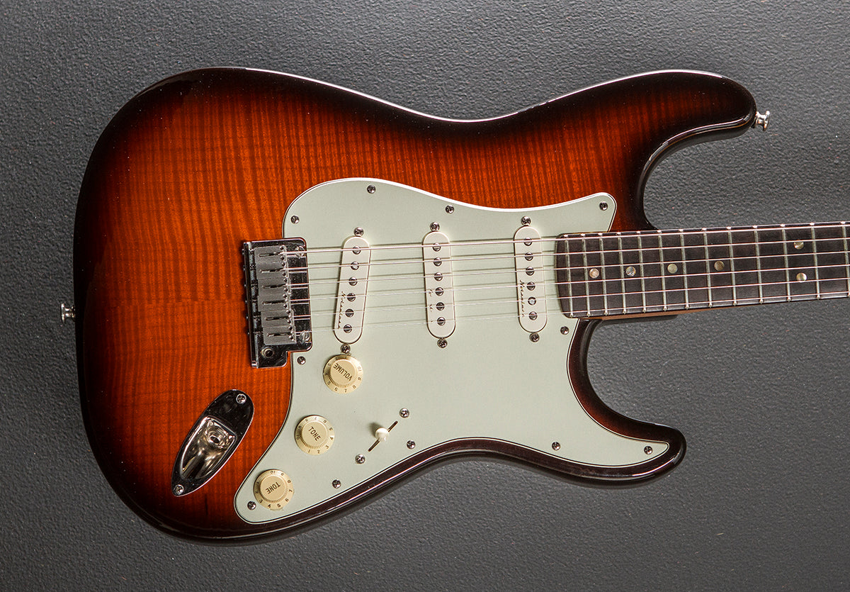 Antique Sunburst, Number 470 of 500, March 1990 body and neck dates, Gloss body and neck finish, Flame Maple top on an Alder body, C shaped Birdseye Maple neck, 9.5” radius Ebony fingerboard with the Abalone dot inlays and medium jumbo frets, 25.5″ scale length, 1 11/16th” nut width, Newer Fender Noiseless Strat pickups were installed and the Clapton style boost was removed, 5-way switching with the rewired volume/tone/tone controls, Two-point tremolo with the block steel saddles, Wilkinson roller nut and locking tuners, The neck thickness is .80″ at the first and .89″ at the 12th frets, 8.8 pounds, With the Fender hardshell case, Very good