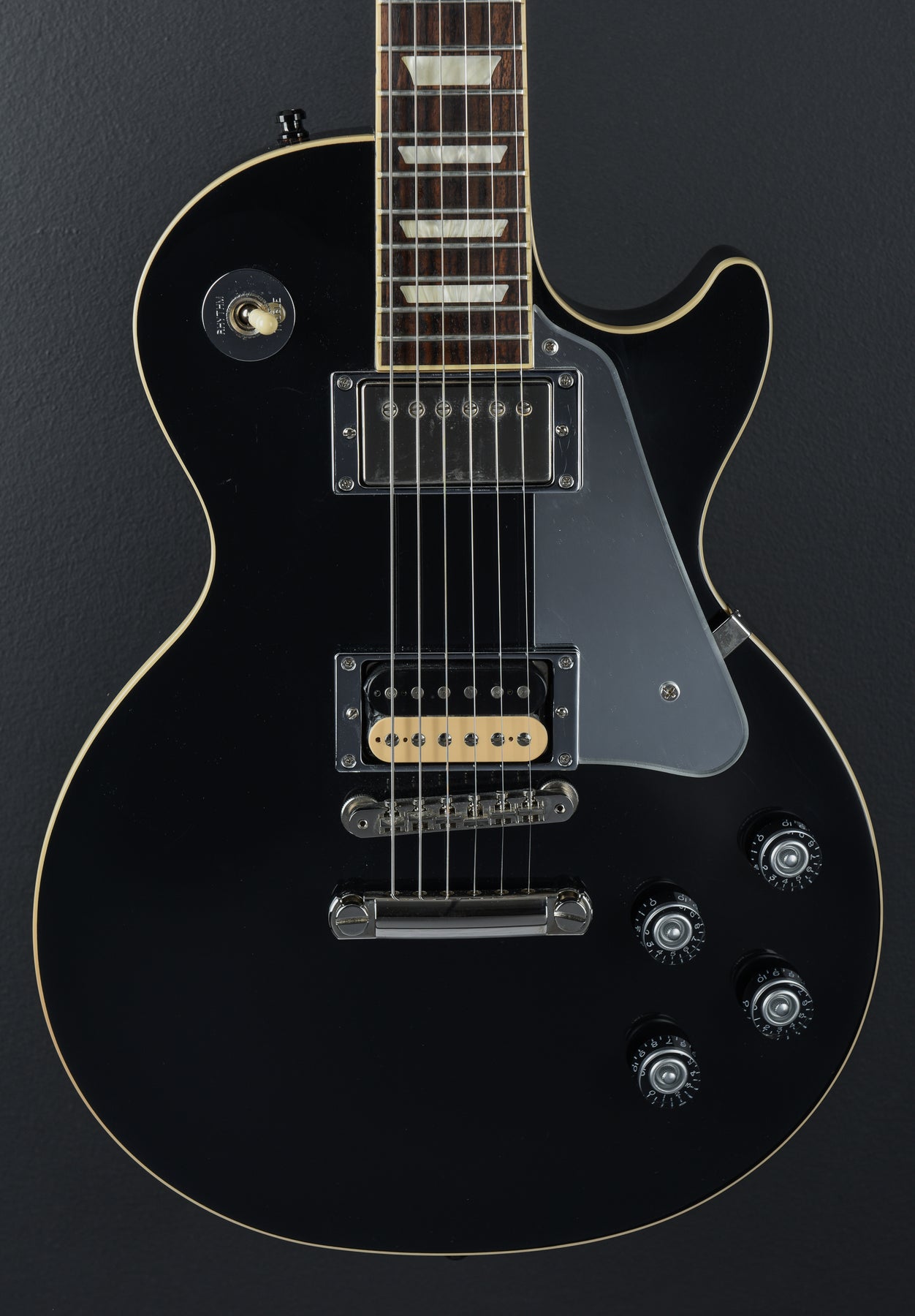 Very Good Condition, Glossy Ebony Finish, Plain Maple Top on a Solid Mahogany Body, Set-Neck Mahogany Neck, Asymmetrical Neck Profile, Compound Radius Rosewood Fingerboard with Trapezoid Inlays and 22 Frets, 24.75" Scale Length, Dual Burstbucker Pro Humbucking Pickups with Coil-Splitting and Boost Circuit, 3-Way Toggle Switching with Individual Volume and Tone Controls, Stop-Bar Tailpiece, Replaced Mirror Pickguard, Replaced Chrome Pickup Rings, Replaced Metallic Truss Rod Cover, Replaced Mirror Pickup Selector Ring, Pickup Cover Added on the Neck Pickup, Locking Grover Tuners, 9.4 Pounds, Comes with a Hardshell Case.