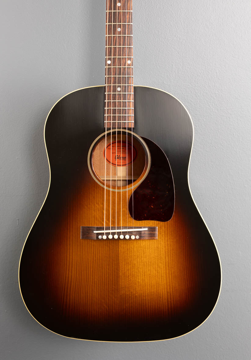 "The allure and legend of the Gibson J-45 lives on in the new Custom Historic 1942 Banner J-45. Inspired by the holy grail of vintage acoustic instruments, luthiers in Montana meticulously crafted a J-45 just like the most popular and celebrated version in structure and components. The new 1942 Banner J-45 includes a Thermally Aged Adirondack red spruce top hand-sprayed with a historic-style burst, hot hide glue top bracing for better tonal response, and a bone nut and saddle."