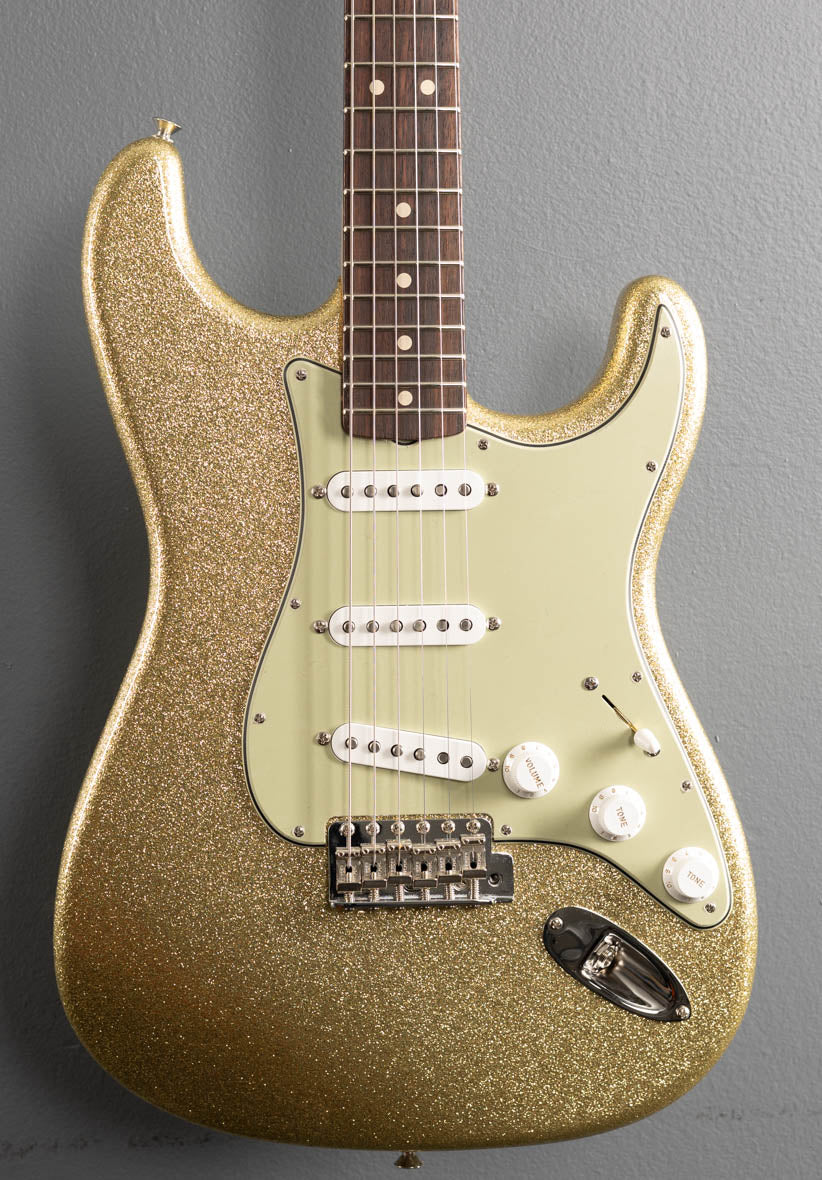 Gold Sparkle, NOS nitrocellulose lacquer finish, Alder body, 60's oval C shaped Maple neck with a 9.5” radius Rosewood fingerboard and medium jumbo frets, 25.5” scale length, 1.650” nut width, Handwound 60's NOS Strat pickups, 5-way switching with the volume/tone/tone controls, American Vintage tremolo with the bent steel saddles, Fender vintage style tuners, 7.8 pounds, With Fender Custom Shop hardshell case