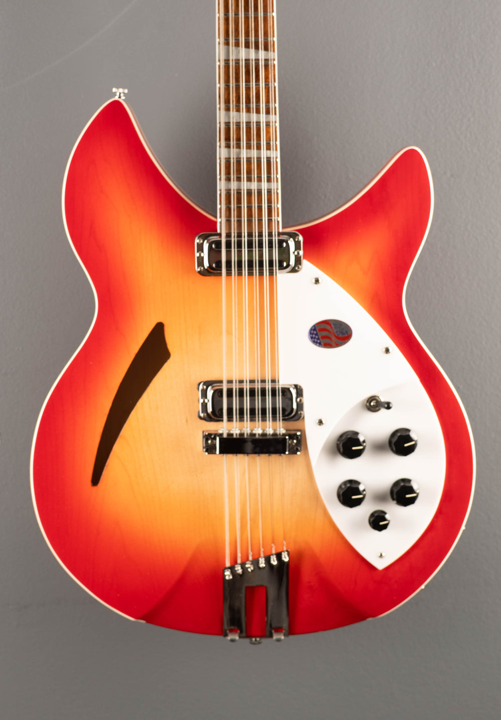 “Created to exact original specifications of the world’s most popular 12-string electric guitar, the 360/12C63 is an accurate replica of the model George Harrison made so famous. Complete with double-bound body, trapeze tailpiece, and unique Rickenbacker 12-string headstock, the 360/12C63 is true to the 1963 version in every aspect— down to the shading on the Fireglo finish.”
