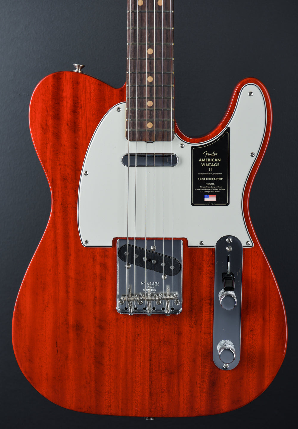 Crimson Red Transparent, Mahogany body, Gloss nitrocellulose lacquer finish, 1963 C shaped Maple neck with a 7.25" radius round laminated Rosewood fingerboard and vintage tall frets, 25.5" scale length, 1.650" nut width, Pure Vintage '63 single coil Tele pickups, 3-way switching with the master volume and tone controls, Pure Vintage string thru body Tele bridge with the three threaded steel barrel saddles, Pure Vintage single line Fender deluxe tuners, 8.3 pounds, With hardshell case