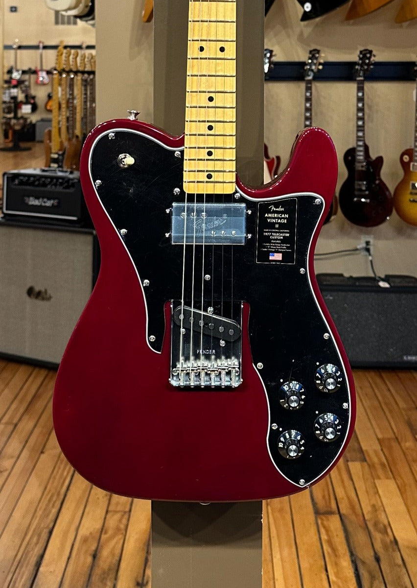 Wine, Alder body, Gloss polyurethane finish, 1977 C shaped Maple neck with a 7.25" radius Maple fingerboard and vintage tall frets, 25.5" scale length, 1.650" nut width, Pure Vintage '77 single coil Tele bridge and Authentic CuNiFe Wide Range humbucking neck pickups, 3-way switching with the volume and tone controls for each pickup, Pure Vintage string thru body Tele bridge with the slotted steel barrel saddles, Pure Vintage Fender “F” stamped tuners, 8.45 pounds, With hardshell case