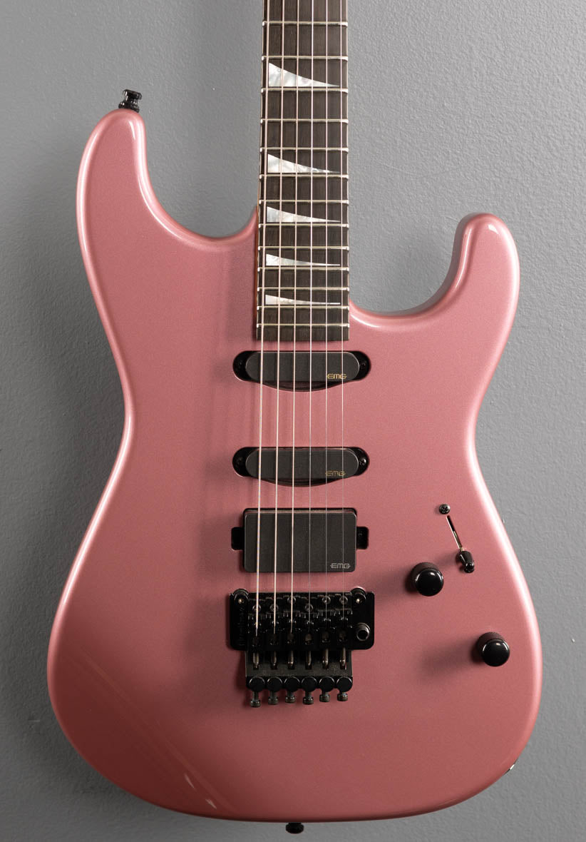Burgundy Mist Metallic, Select Alder body, 12"-16" compound radius Ebony fingerboard with Luminlay side dots, Mother of Pearl Sharkfin Inlays and extra jumbo frets on a Roasted Maple neck, 25.5" scale length, 1.6875" nut width, EMG 81 Bridge and EMG SA middle/neck pickups with 5 way switching, Top Mounted Floyd Rose Original tremolo bridge, Schaller tuners, 8.5 pounds, comes with COA and hardshell case.