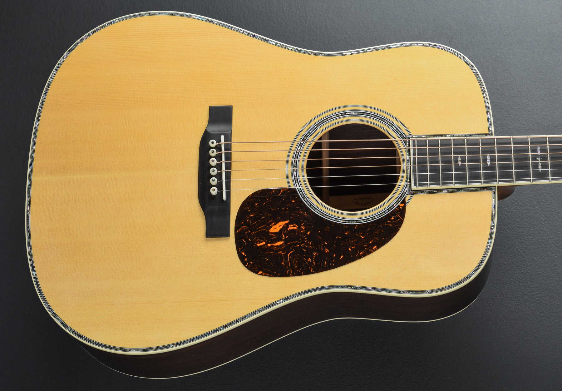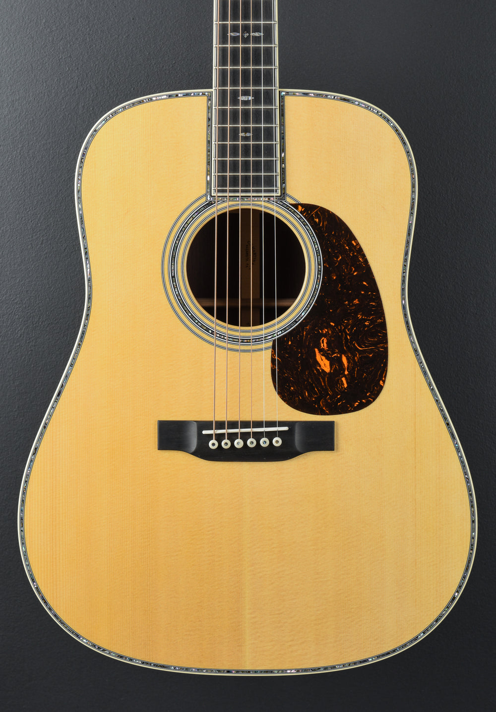 Natural, D-14 Fret body shape, Solid Spruce top, GE-Scalloped Forward-Shifted X-Bracing, Abalone with multi-stripe Rosette, Antique White binding with Abalone multi-stripe top, multi-stripe back and side inlay, Solid East Indian Rosewood back and sides, Style 45 back purfling with Black Stripe, Bound 16" radius Ebony fingerboard with the Abalone Style 45 Snowflake position markers on a GE Modified Low Oval w/high performance taper shaped Genuine Mahogany neck, 25.4” scale length, 1 3/4″ width at the nut, With hardshell case.