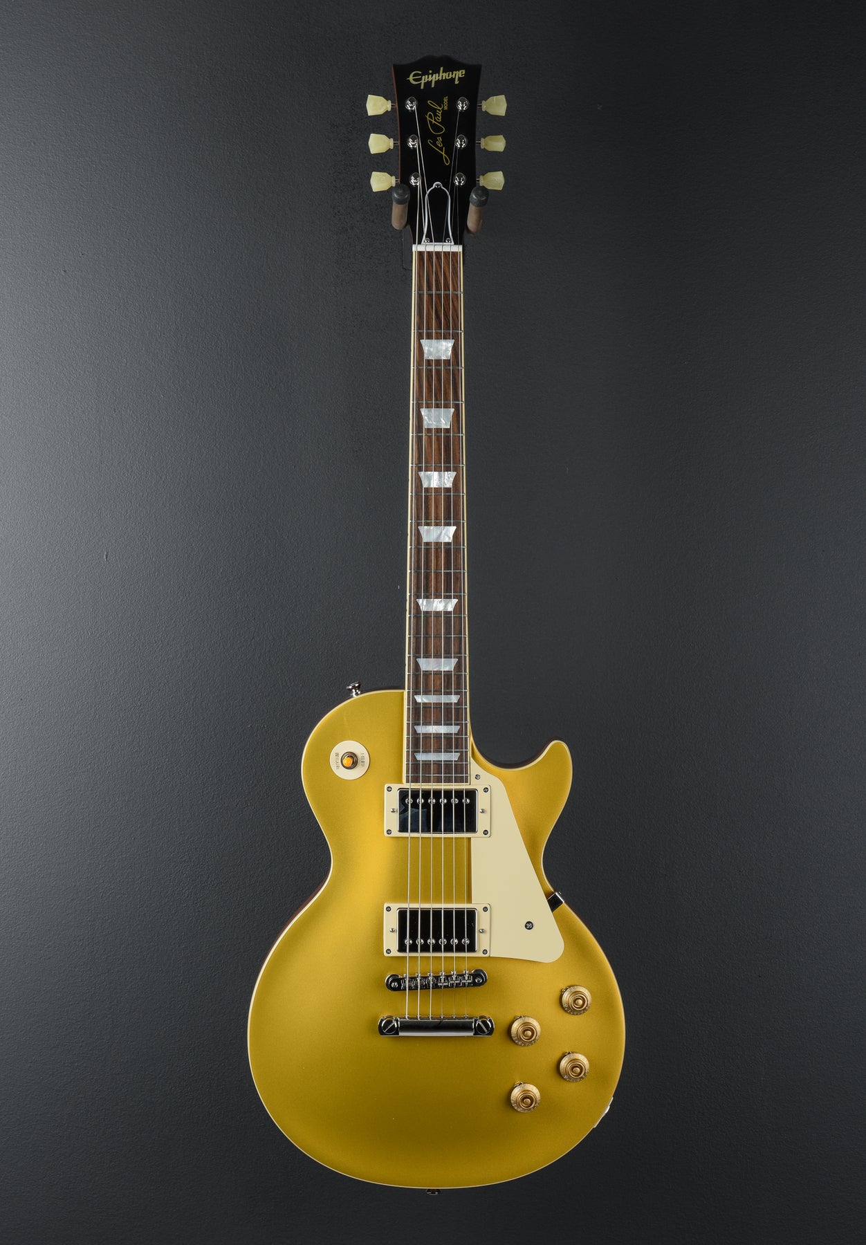 Brand New, Double Gold Finish, Vintage Gloss Body Finish, Carved Maple Top on a Mahogany Body, 50's Rounded Medium C Shaped Mahogany Neck, Bound 12" Radius Rosewood Fingerboard with Mother of Pearl Trapezoid Inlays and Medium Jumbo Frets, 24.75" Scale Length, 1.692" Nut Width, Gibson Custombucker Bridge and Neck Pickups, 3-Way Toggle Switching with Volume and Tone Controls for Each Pickup, ABR-1 Tune-O-Matic Bridge and Gibson Historic Reissue Aluminum Stop Tailpiece, Epiphone Deluxe Single Ring Tuners, 11.3 Pounds, With the Lifton-Inspired Hardshell Case.