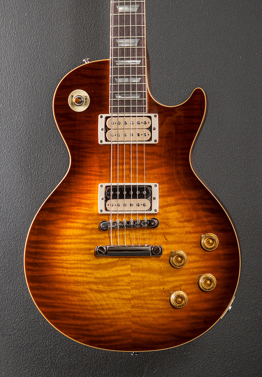 Minnesota Burst, Gloss nitrocellulose lacquer finish, Two piece carved AAA Flame Maple top that was hand selected by our shop, One piece lightweight Mahogany body, Hide glue construction and long tenon neck joint, 50's rounded medium C shaped Mahogany neck, Bound 12” radius Indian Rosewood fingerboard with the cellulose nitrate trapezoid inlays and authentic medium jumbo frets, 24.75” scale length, 1.69" nut width, Unpotted uncovered zebra coil Custombucker Alnico III bridge and unpotted uncovered double white coil Custombucker Alnico III neck pickups, 3-way toggle switching with the volume and tone controls for each pickup, No wire ABR-1 tune-o-matic bridge and lightweight aluminum stop tailpiece, Kluson single line/single ring tuners, The neck thickness is .88″ at the first and .99″ at the 12th frets, 8.6 pounds, With the Lifton hardshell case