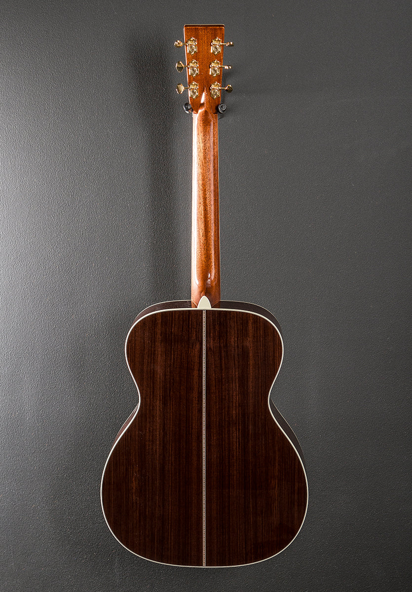 Natural, Gloss top/body and neck finish, 000-14 Fret body shape, Solid Spruce top, Abalone with multi-stripe Rosette, Golden Era scalloped X bracing, Solid East Indian Rosewood back and sides, Antique White binding with the Abalone top w/multi-stripe top/back/side inlay, Style 45 with black stripe back purfling, Golden Era modified low oval w/high performance taper shaped Mahogany neck, Bound Ebony fingerboard with the Abalone Style 45 Snowflake position markers, 24.9” scale length, 1 3/4” nut width, Grover open gear tuners, With hardshell case