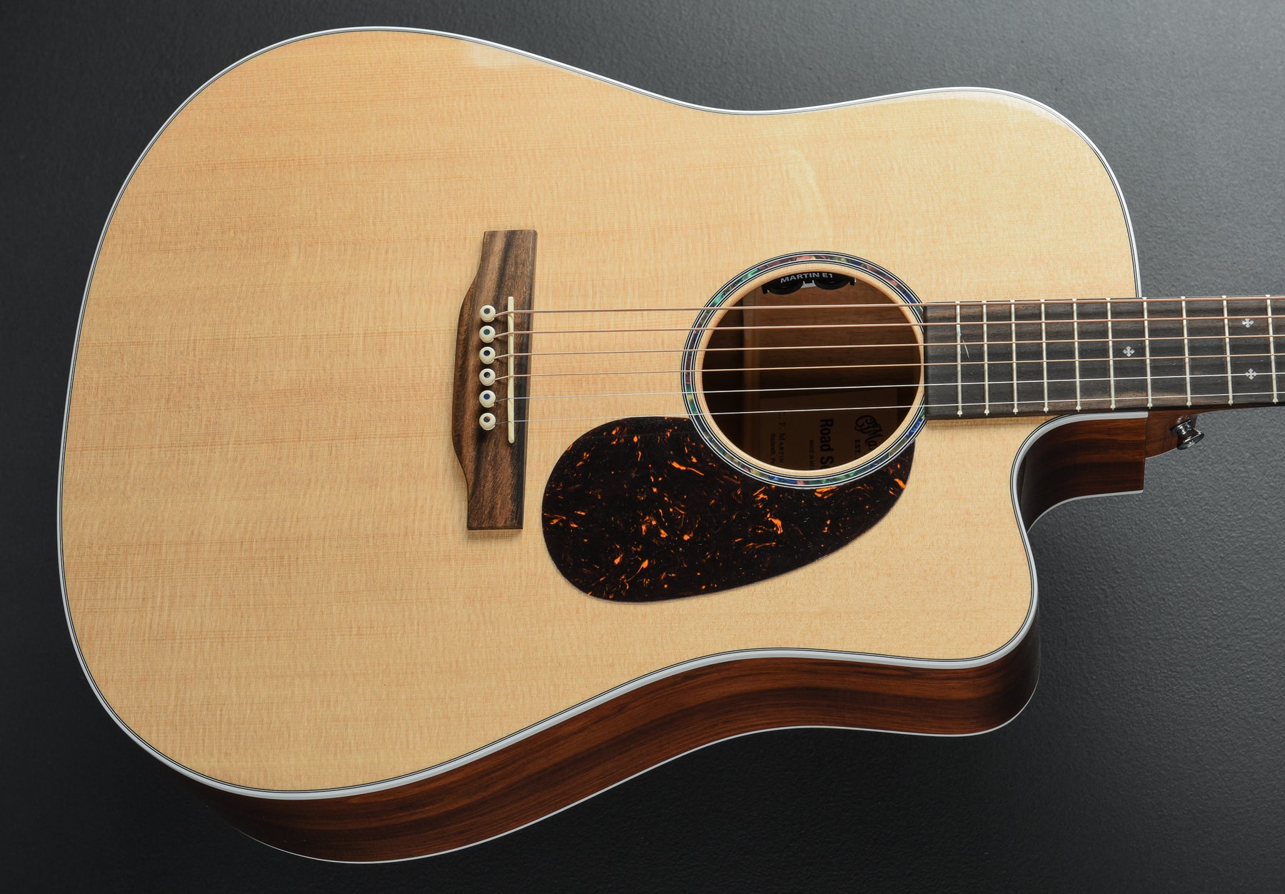 Natural, Gloss top and body finish, D-14 Fret cutaway body shape, Spruce top, Single ring faux Abalone Rosette, Scalloped X bracing, Koa fine veneer back and sides, White multi-ply top and single-ply back binding, Performing Artist w/high-performance taper shaped select hardwood neck, Ebony fingerboard with the faux Mother of Pearl long Diamond and Squares position markers, 25.4” scale length, 1 3/4” nut width, Open gear tuners, With the Martin E1 pickup system and soft case