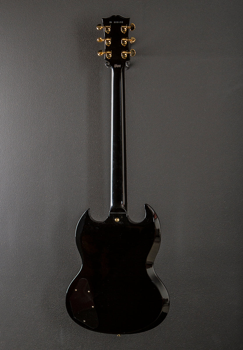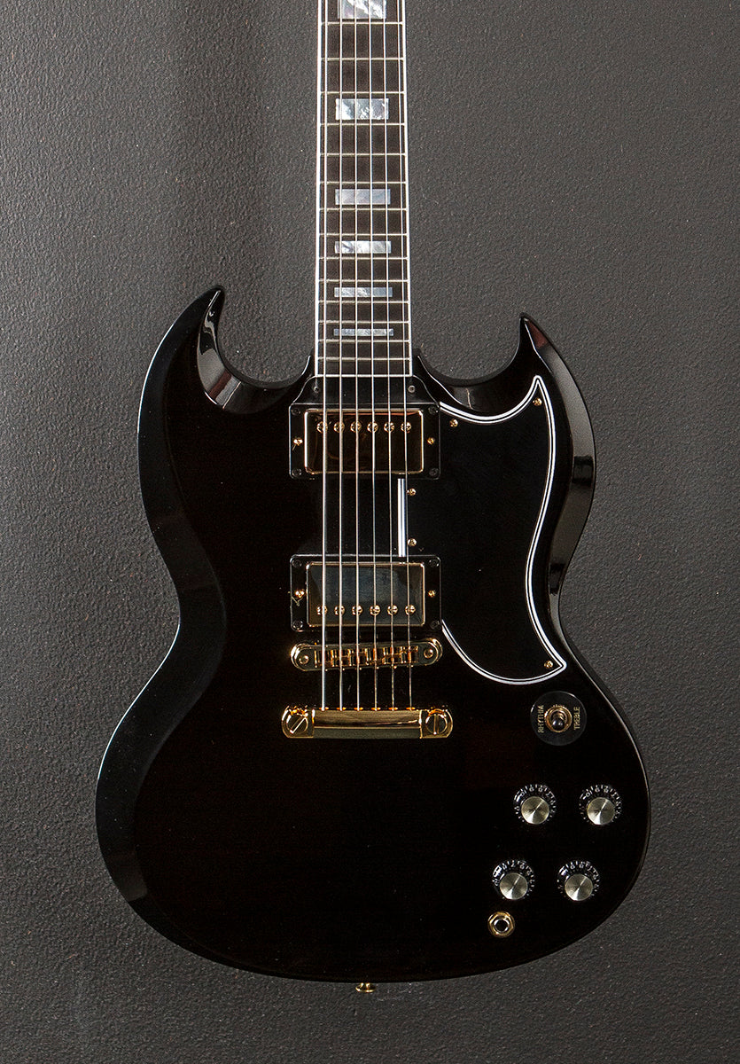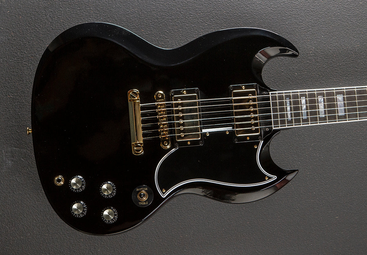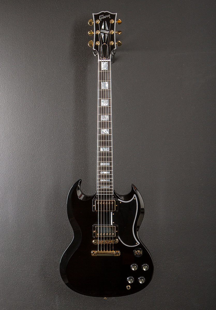 “This recent Custom Shop addition takes the engine and aesthetics of the iconic Les Paul Custom and applies them to the SG platform. The result is a huge-sounding, fast-playing and classy-looking instrument that will bring out the best in any player. The solid ebony fingerboard projects chords and notes with clarity and sustain, while the 490R and 498T humbuckers compliment a wide range of sonic possibilities, from clean jazz to the heaviest distortion.”