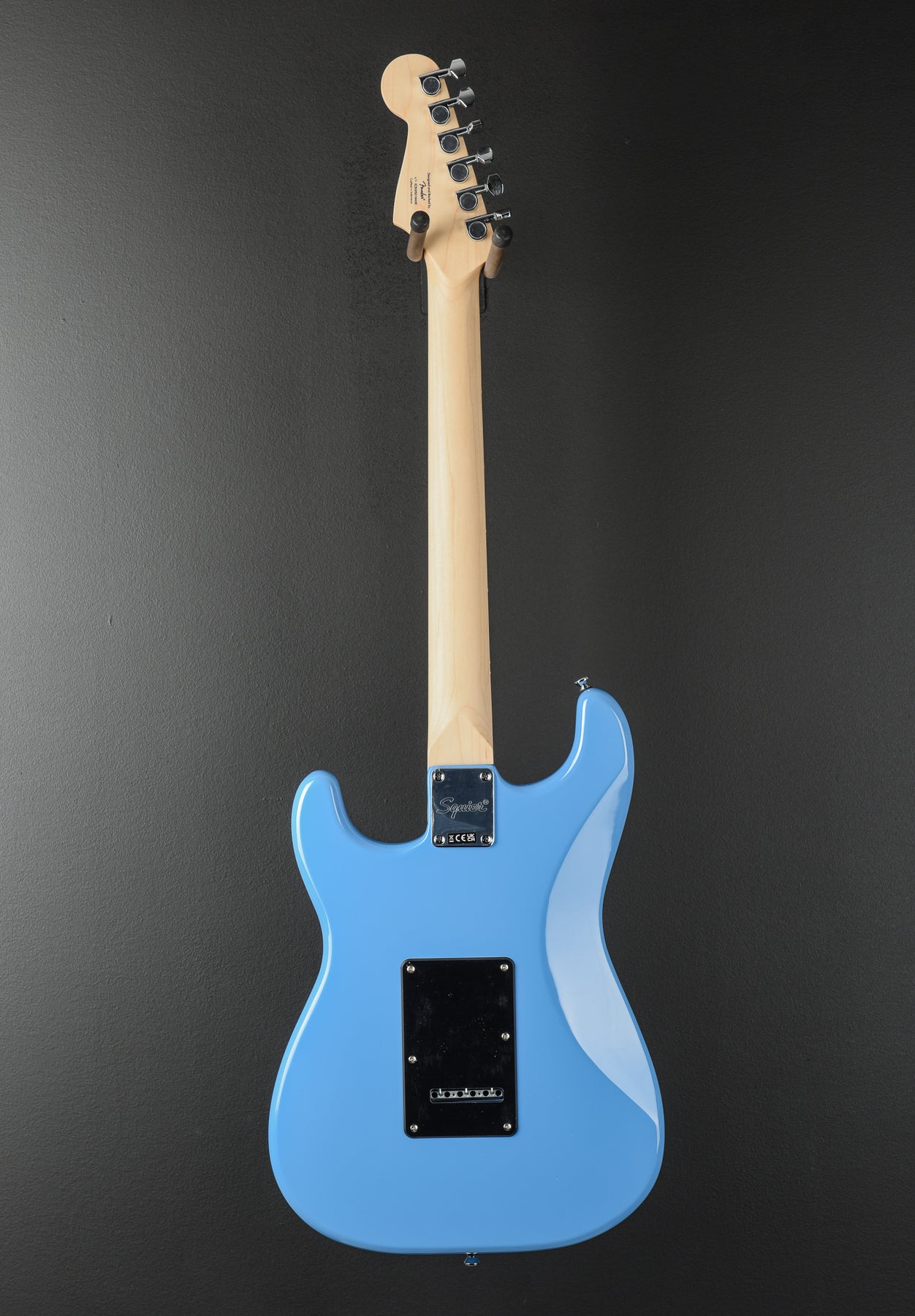 California Blue, Crafted in Indonesia, Poplar body, Gloss polyurethane body finish, C shaped Maple neck with a 9.5” radius Indian Laurel fingerboard and narrow tall frets, 25.5" scale length, 1.650" nut width, Ceramic single coil pickups, 5-way switching with the master volume, tone 1. (neck/middle pickups) and tone 2. (bridge pickup) controls, Vintage style synchronized tremolo with block saddles, Cast/sealed tuners, 7.7 Pounds Case not included