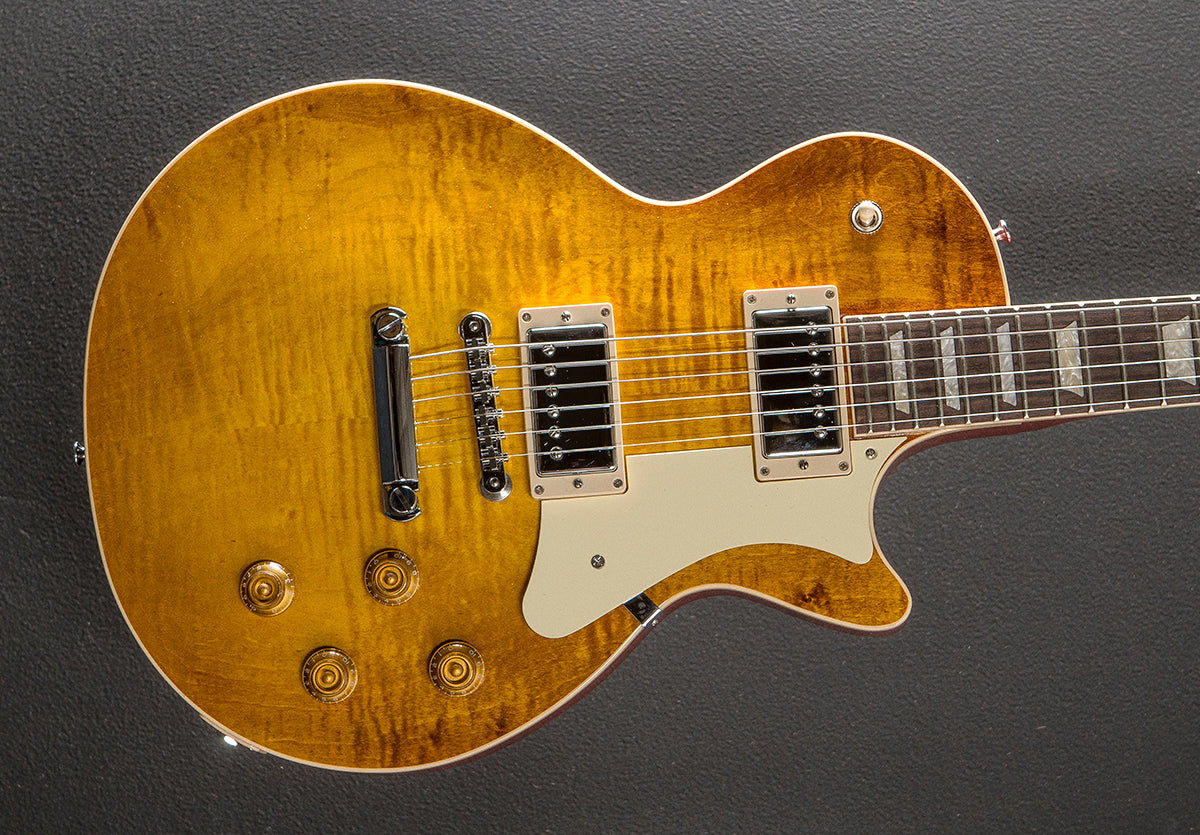 Dirty Lemon Burst, Gloss nitrocellulose lacquer finish, Curly Maple top on a Mahogany body, Cream binding, Standard C shaped Mahogany neck, Bound 12” radius Rosewood fingerboard with the acrylic trapezoid inlays and medium jumbo frets, 24.75" scale length, 1 11/16th" nut width, Seymour Duncan '59 bridge and neck pickups, 3-way toggle switching with the volume and tone controls for each pickup, Non-locking tune-o-matic bridge and stop tailpiece, Heritage cast/sealed tuners, The neck thickness is .87″ at the first and .99″ at the 12th frets, 9.4 pounds, With the Heritage hardshell case, Excellent